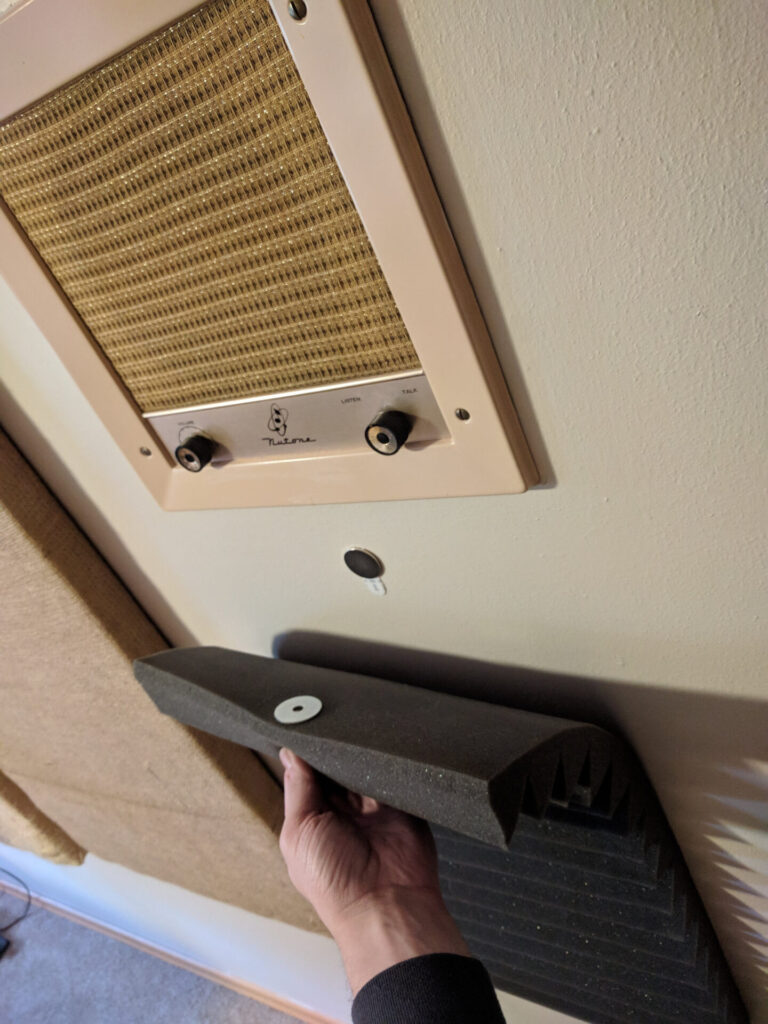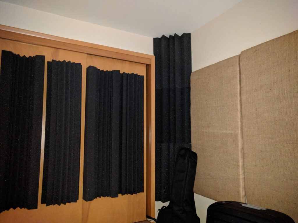 For the reflections (a.k.a. flutter echo), I had already made some 2″- and 1″-thick panels with ATS Acoustics rigid fiberglass, but those only absorb mid-range frequencies like the high end of my vocal range. That’s okay for the side walls, so I put the thickest panels on either side of where I’d be sitting and worked my way back to the closet.